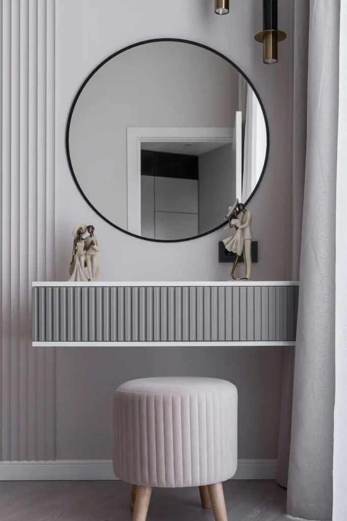 Use mirrors, layered lighting, metallic accents, and soft grey décor.