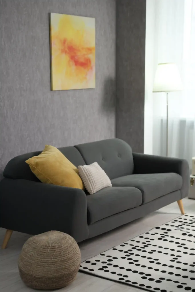 A patterned grey rug or black-and-white design helps visually anchor your seating area. Keep it low-pile so it doesn’t crowd the space. Rugs also soften the look and connect your furniture into one cohesive zone.