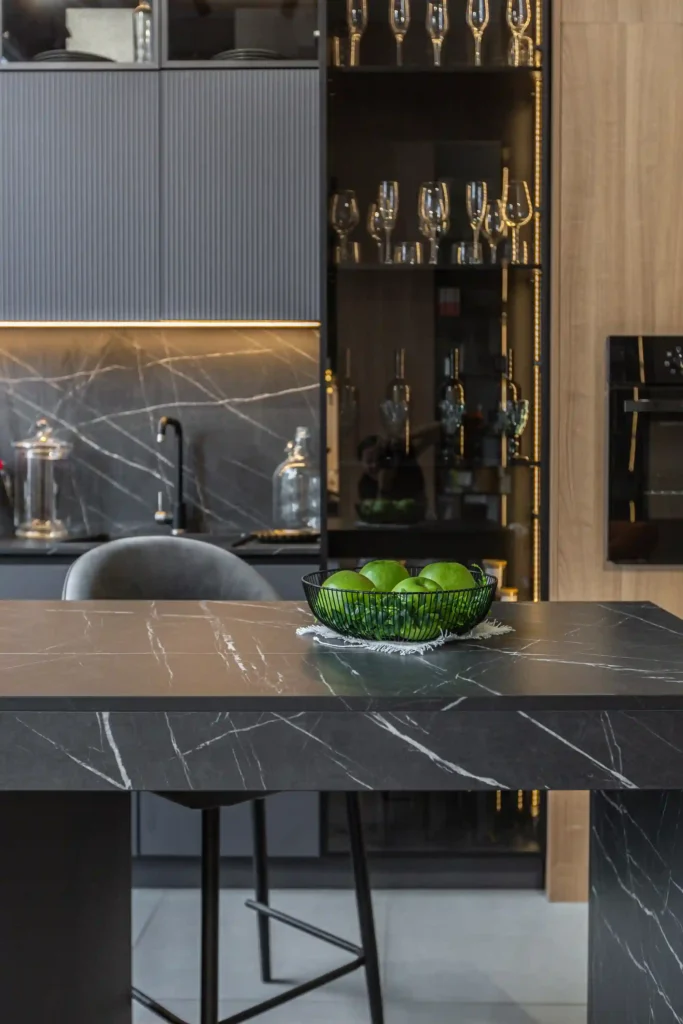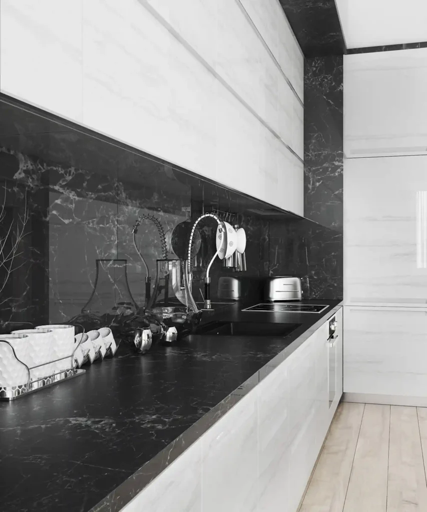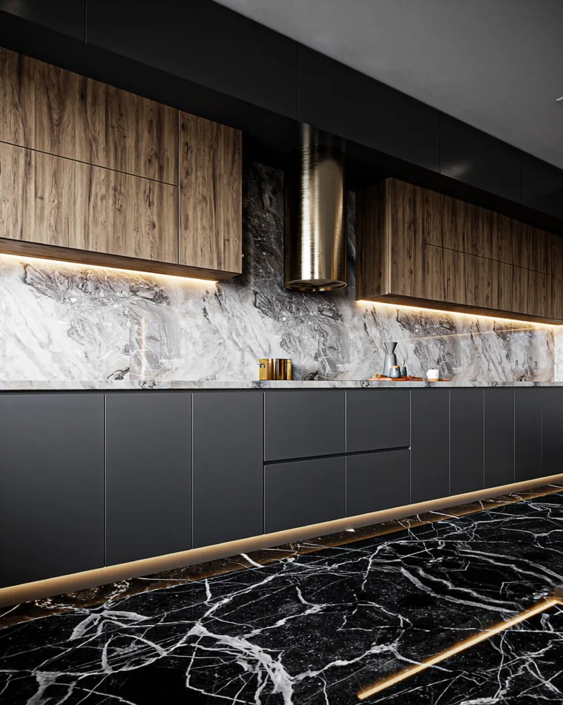 11. Moody black marble vein backsplash