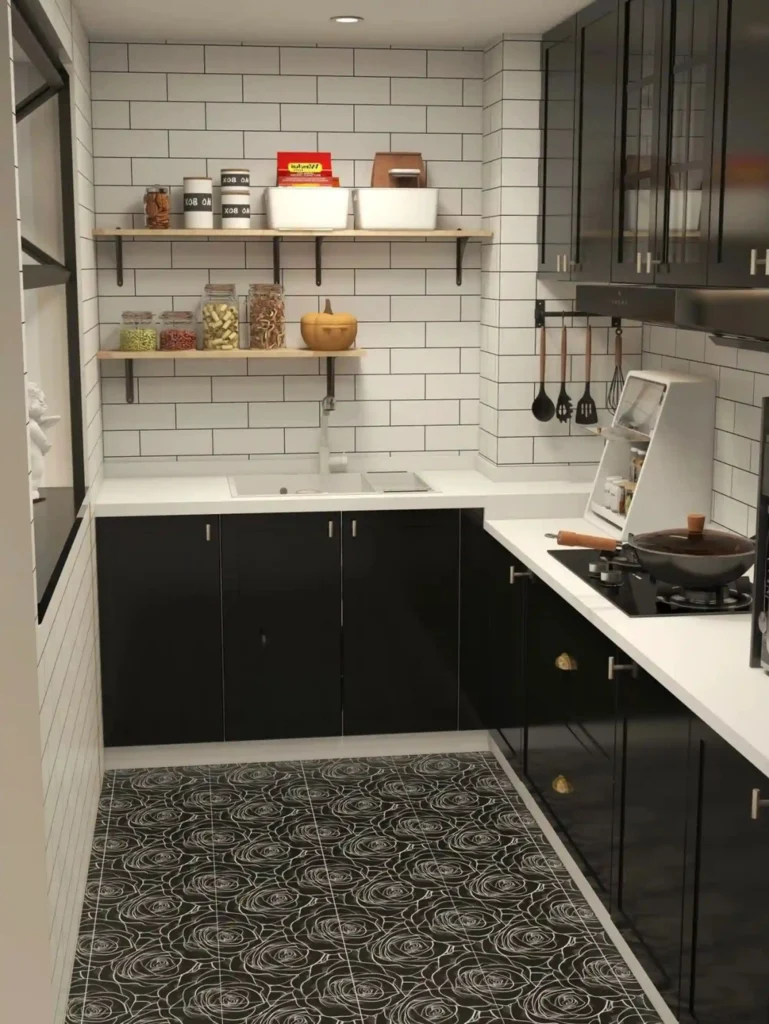 You can use black tiles in a small kitchen! Dark tiles make walls seem farther away, helping the space feel larger. Use matching grout for a smooth look.