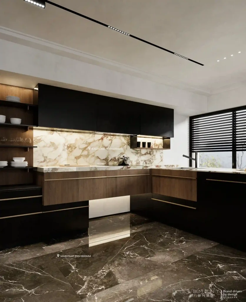 For an elegant touch, choose black marble or marble-look tiles. The white or gold veins add style and prevent the design from appearing flat.