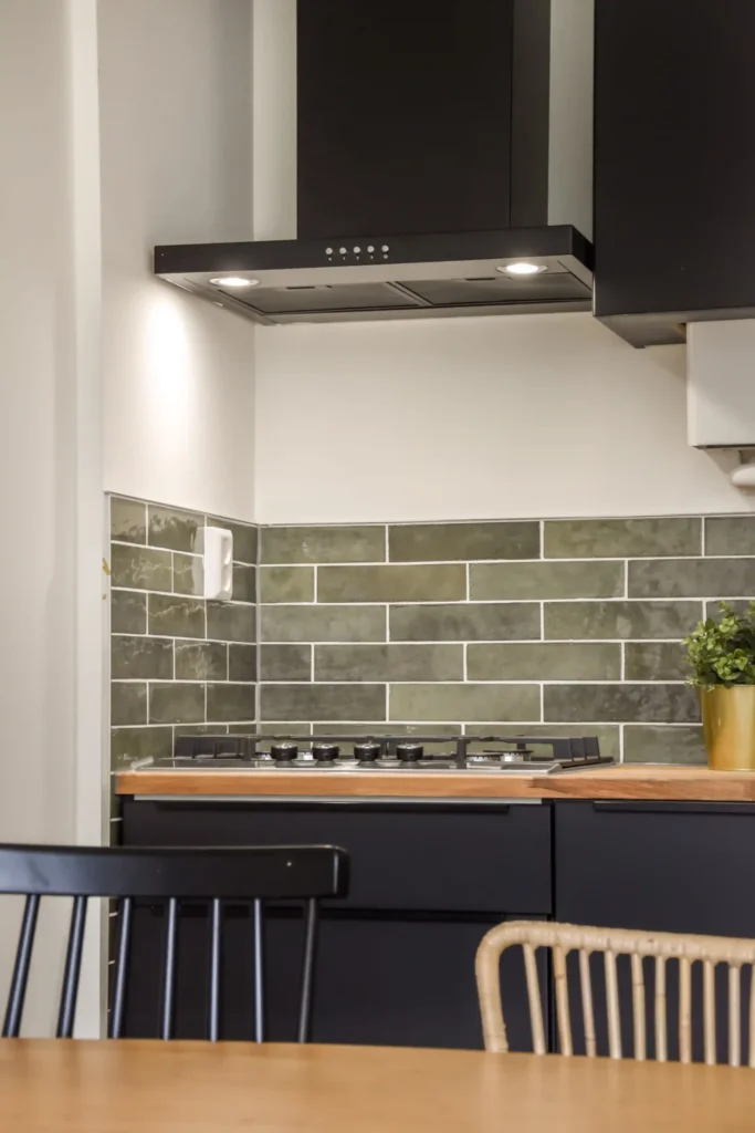 For areas behind the stove, choose heat-resistant black tiles, like porcelain or tempered glass. They can handle high heat and splatters without cracking.