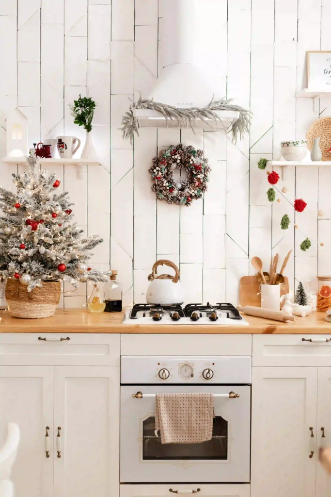 Combine wood, white, and greenery for a sleek, Scandinavian-inspired kitchen. This way, your kitchen will feel airy, stylish, and uncluttered, which is perfect for modern minimalist Christmas cabinet decor.