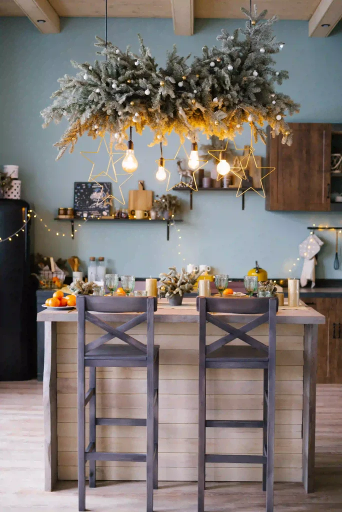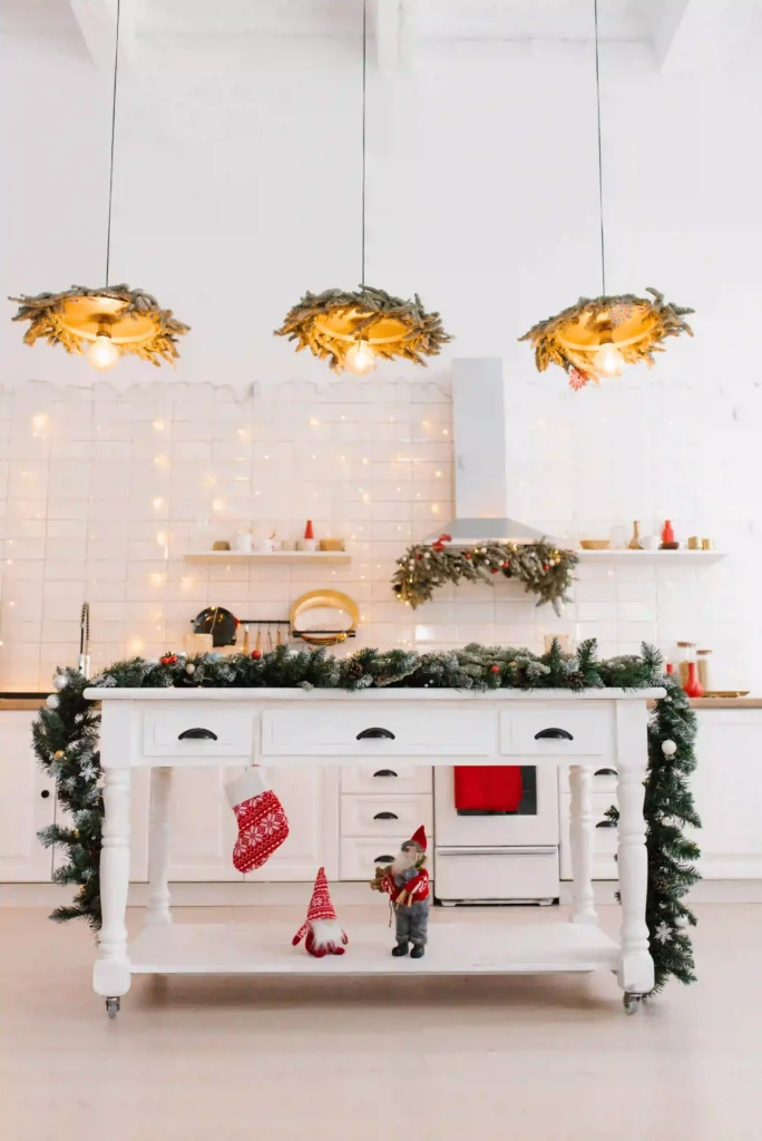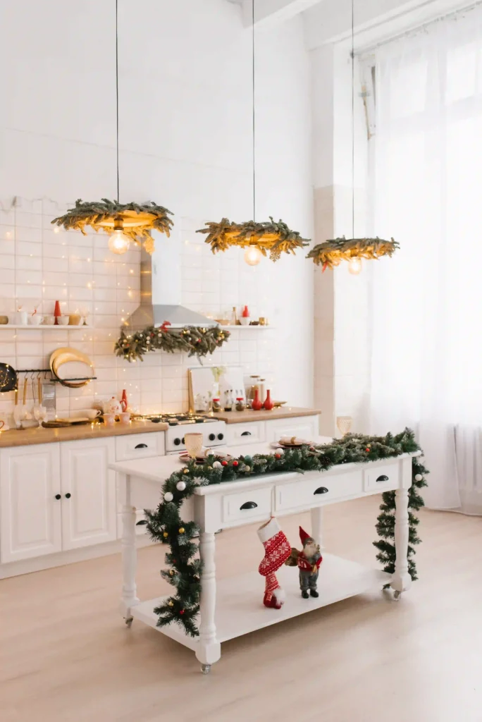 Drape faux pine, eucalyptus, or seasonal greenery garlands across upper cabinets for an instant touch of holiday magic.