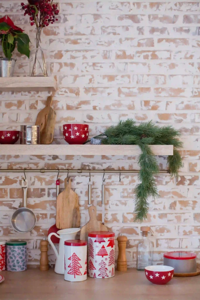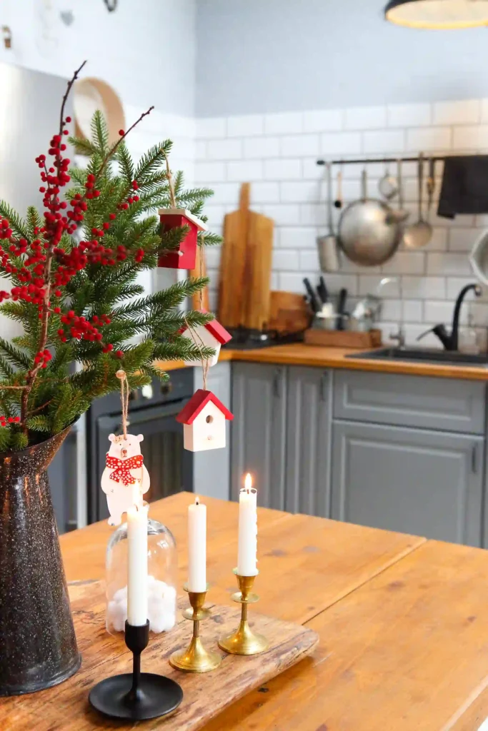 Combine with fairy lights or berries to create a winter wonderland kitchen decor look. It’s an easy way to incorporate holiday kitchen decor without overcrowding the space.