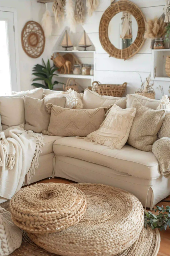 Organic materials charm cozy spaces. Use rattan baskets, wooden furniture, and plants for balance.