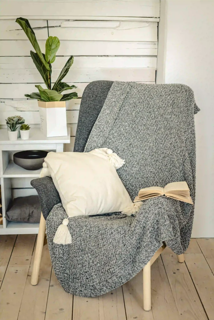 Every cozy room benefits from a reading corner with a comfy chair, throw, and warm light.