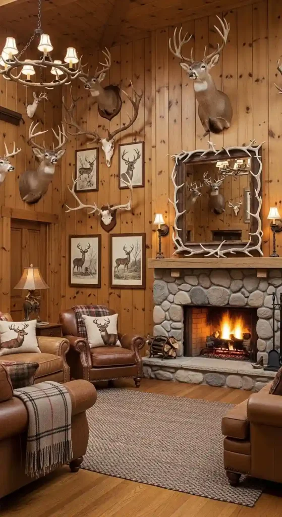 In cabin-inspired interiors, deer mounts complement wood beams, plaid textiles, and stone fireplaces. This cozy look creates warmth and authenticity.