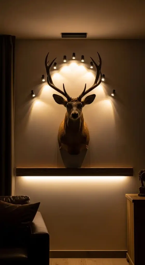 Accent lighting enhances the visual appeal of deer mounts. Wall sconces or spotlights highlight textures and create depth.