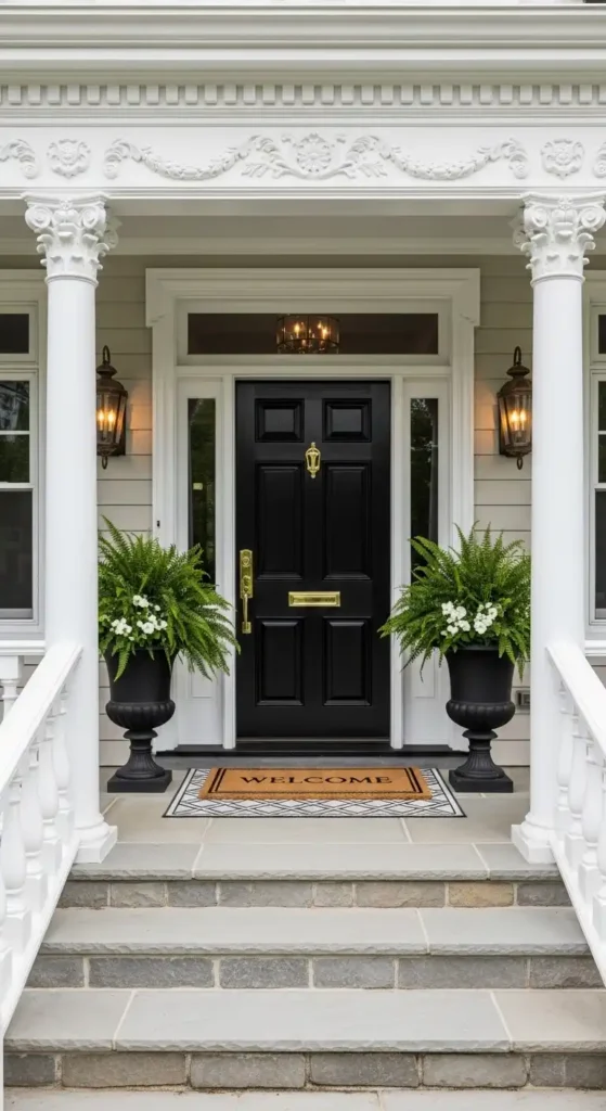 An elegant porch entrance uses stylish decor elements like planters, wall art, and decorative mats. These small details add personality and charm.