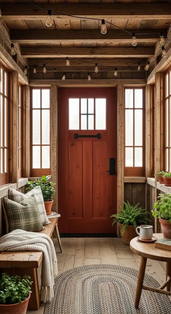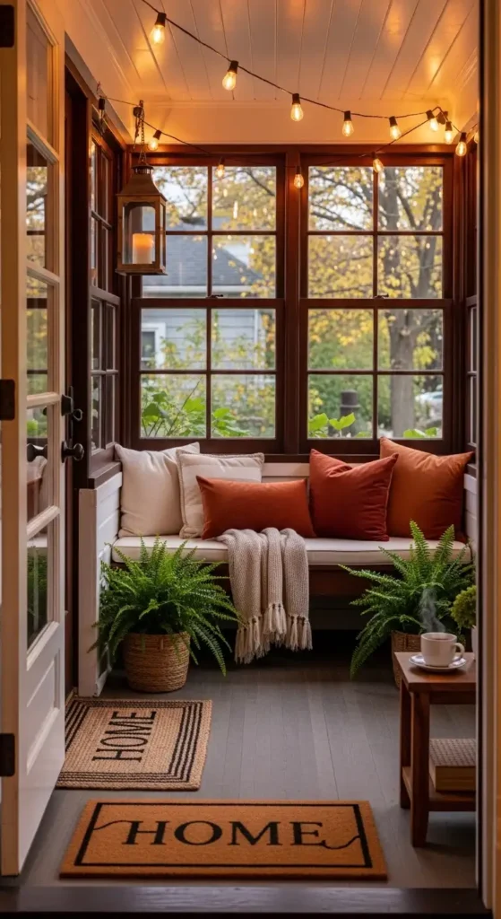 Lighting plays a huge role in enhancing your enclosed porch entrance. Wall sconces, pendant lights, or lantern-style fixtures create a warm and inviting glow.