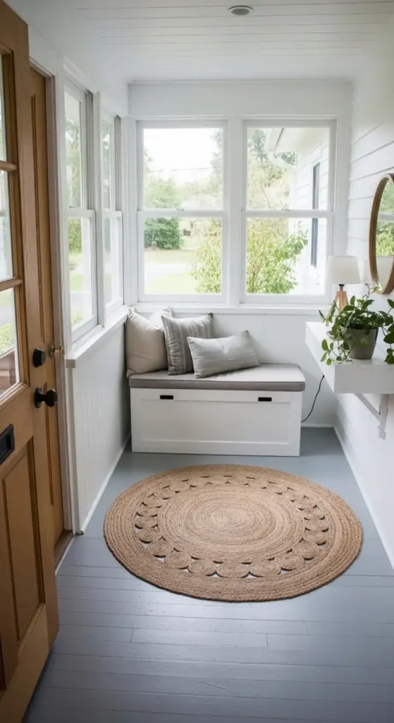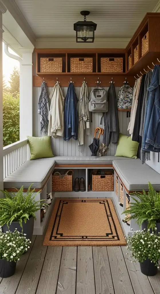 A mudroom-style porch is practical and useful. It usually has storage benches, shoe racks, and hooks for coats and bags.