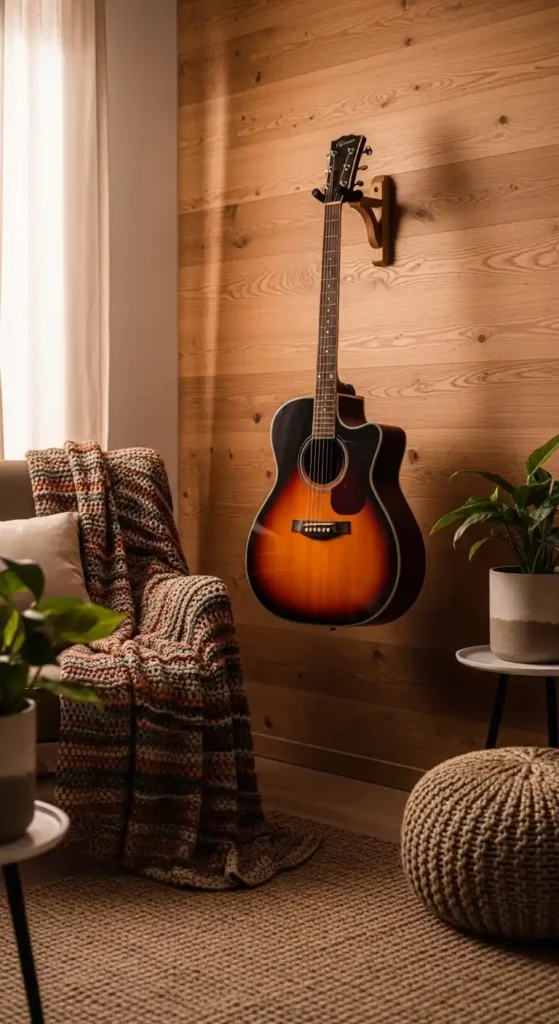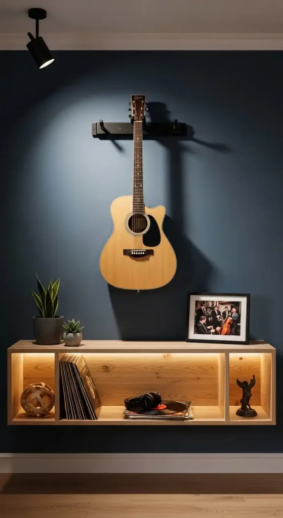 Combine a wall-mounted guitar hanger with a floating shelf underneath. Display picks, small amps, framed music art, or décor pieces. This layered look adds depth and personality.