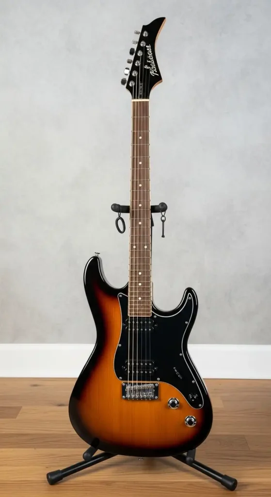 In music studios, mount guitars above sound panels or near recording equipment for easy access. This practical yet stylish arrangement keeps everything within reach during sessions.