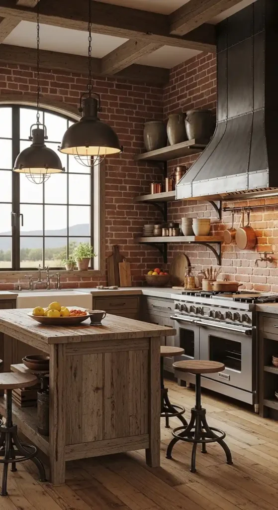 Exposed brick or brick-style coverings add warmth and texture to kitchen walls. This design is perfect for farmhouse, industrial, or vintage-style kitchens.