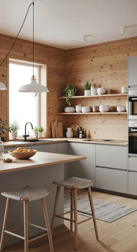 Wood panels bring natural warmth and depth into kitchen interiors. They work beautifully in Scandinavian and rustic kitchen designs.