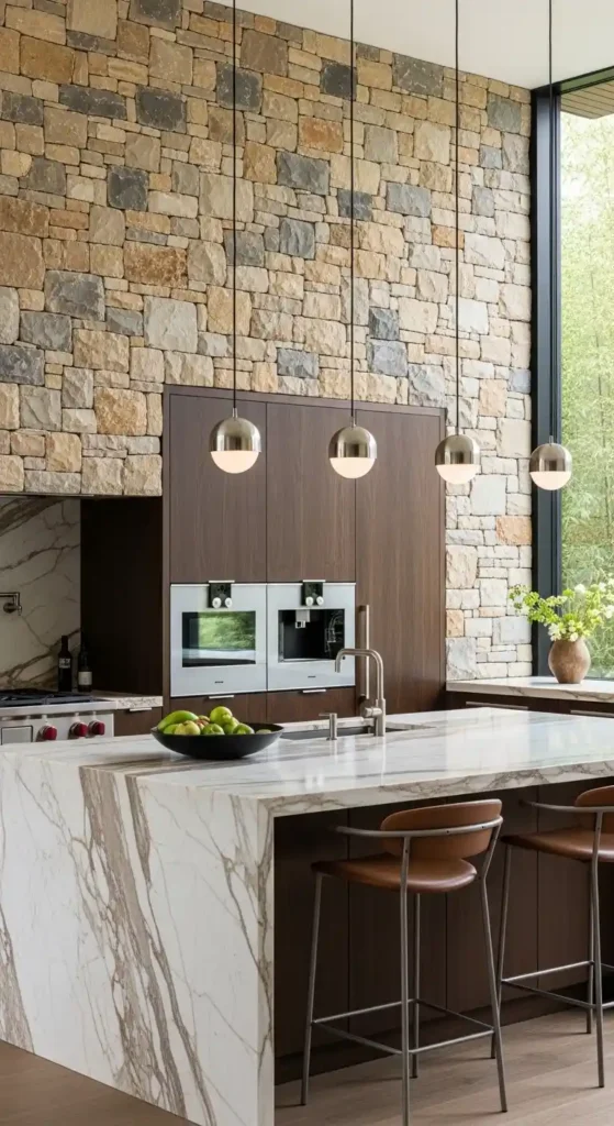Stone wall coverings, such as slate, marble, or travertine, add a luxurious, natural look. They create depth and texture, making the kitchen feel high-end and timeless.