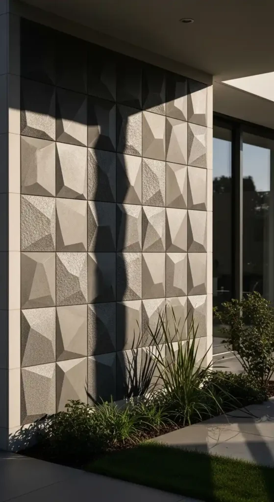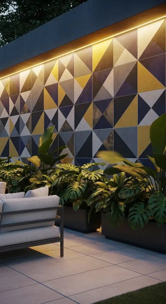 Patterned tiles can turn an outdoor wall into a standout feature. Geometric designs, Moroccan patterns, or abstract prints add personality and style.