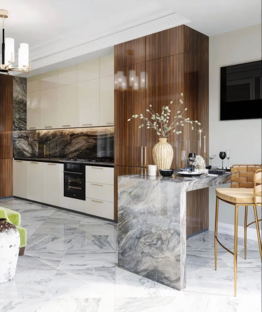 11. Rustic Kitchen Backsplash with Marble & Wood Mix