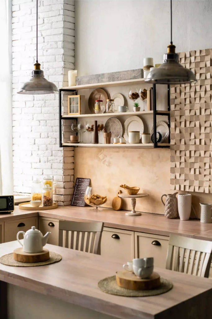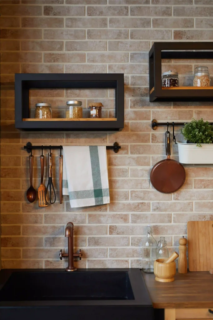 An exposed brick backsplash contributes a cozy, vintage feel while blending rustic charm with industrial style. Whitewashed or natural red brick adds warmth and character, making your kitchen feel timeless.