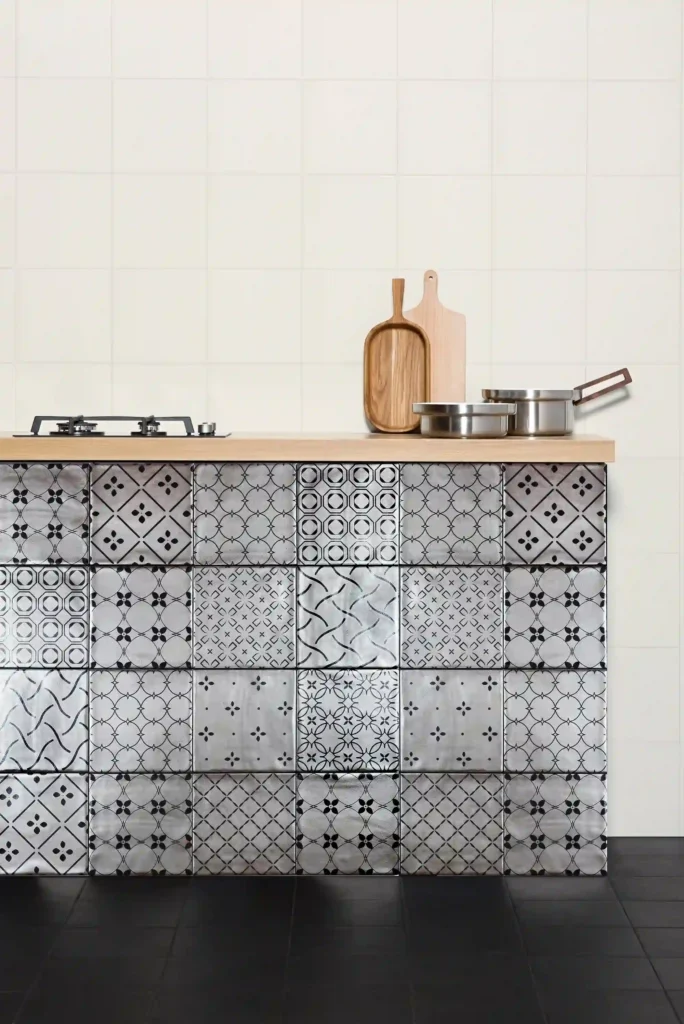 Patterned cement tiles merge vintage flair with rustic charm. They are durable, eye-catching, and perfect for farmhouse kitchens.