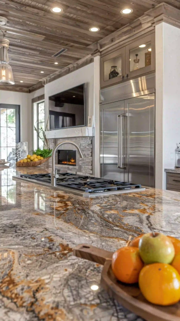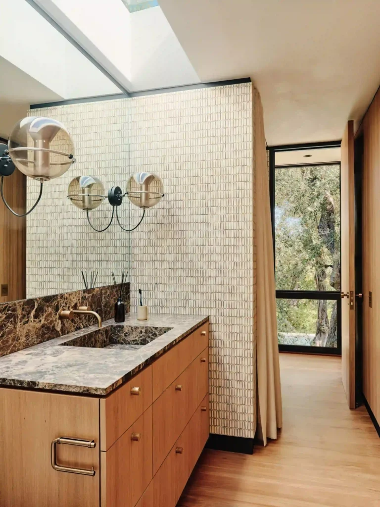 Combining marble tiles with rustic wood accents creates a unique balance of luxury and farmhouse simplicity. It’s an unexpected yet stylish pairing.