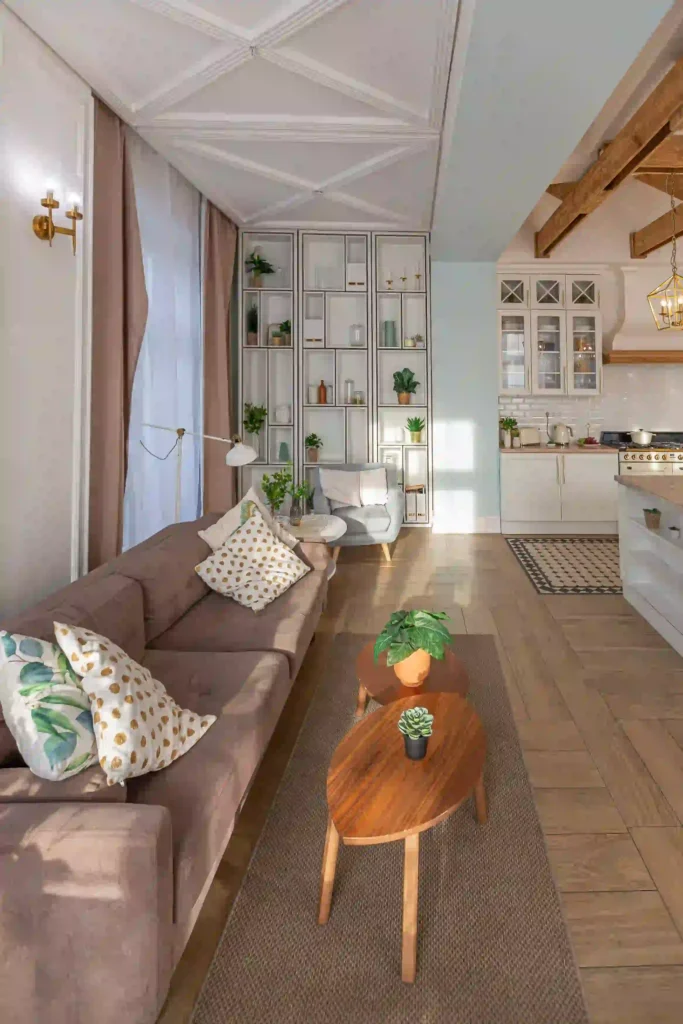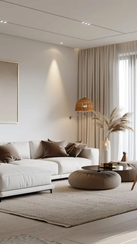 A low-profile rug anchors your seating area, while a round or oval coffee table softens hard edges. Together, they improve flow and prevent the room from feeling boxed in.