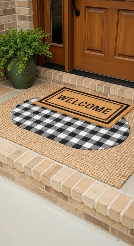 Layering a patterned rug under a simple doormat adds texture and depth to your stoop. It’s a small detail that makes a big visual impact.