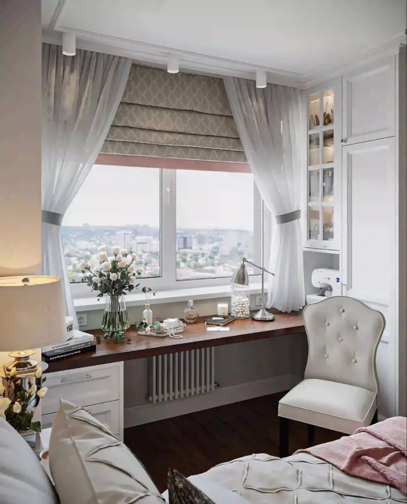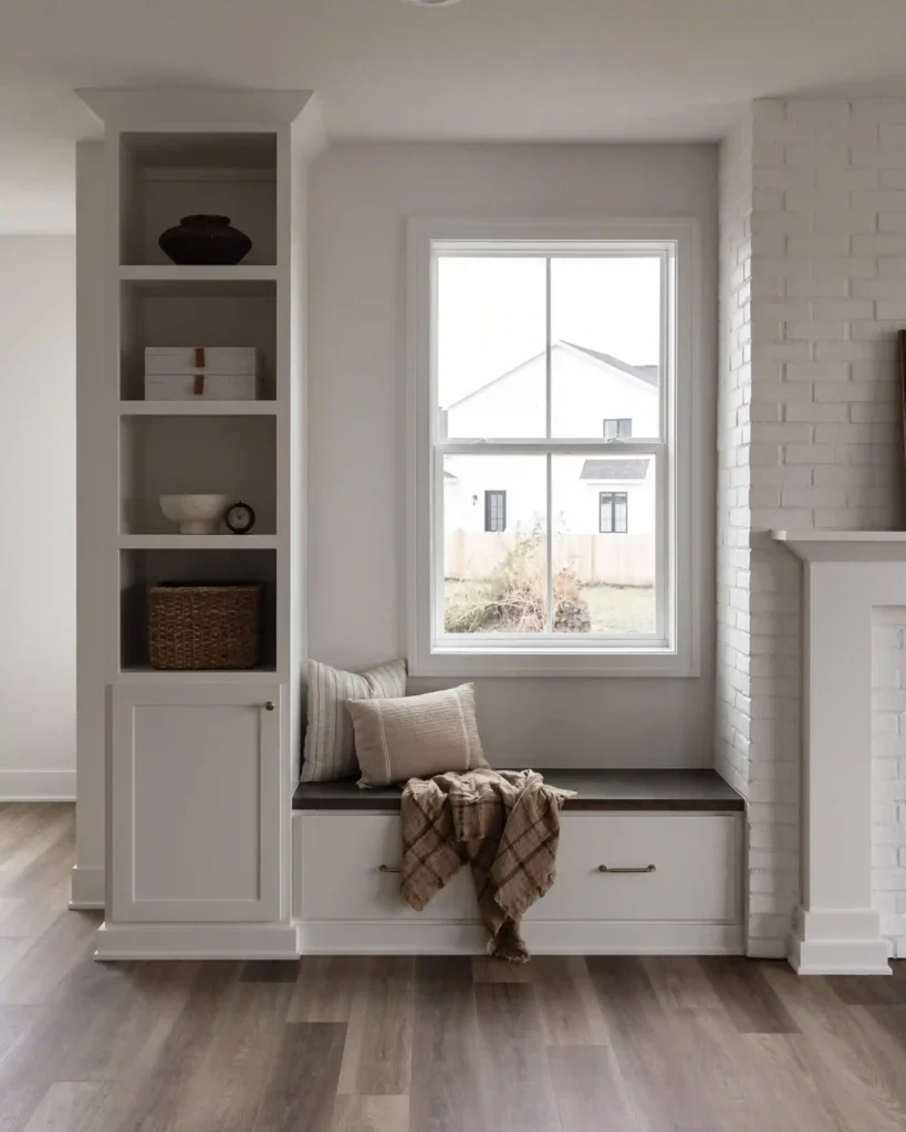 Use built-in shelves, under-seat storage, or narrow cabinets around the bay window to store books, décor, or blankets. This keeps the area tidy while using the otherwise wasted space efficiently.