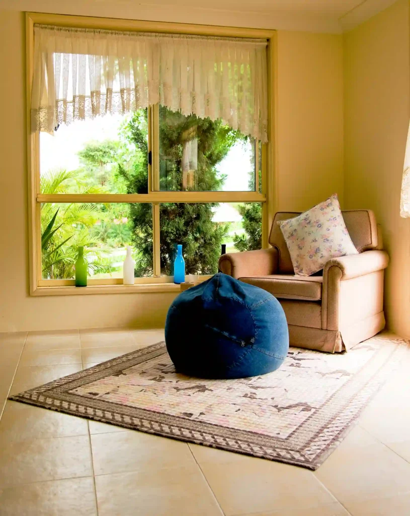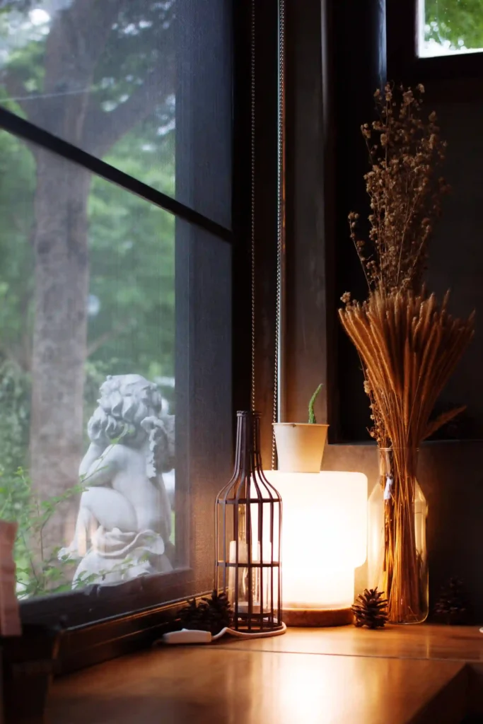 Add small table lamps, pendant lights, or fairy lights around the bay window to create ambiance. Layered lighting enhances the cozy corner feel, especially in evenings when natural light fades.