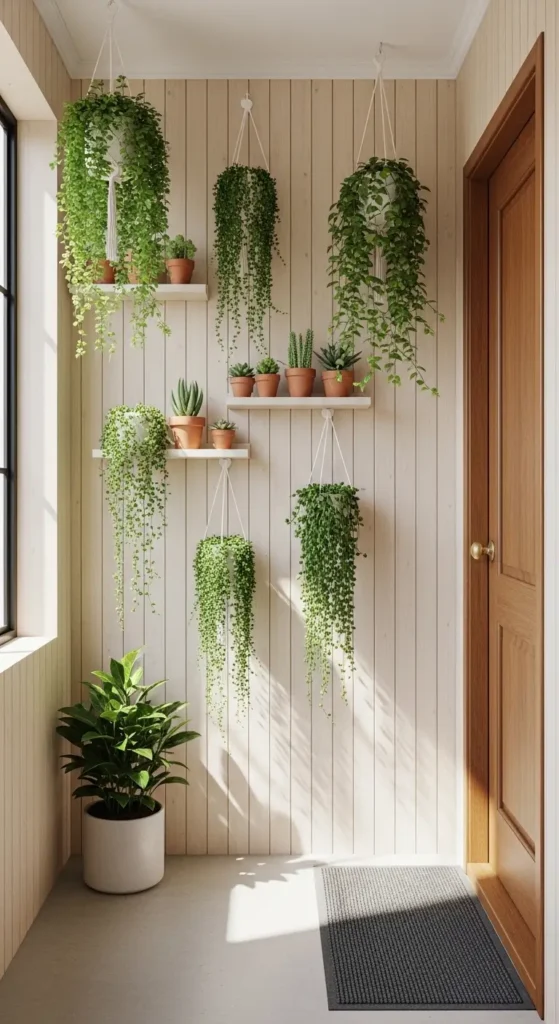 When floor space is limited, use vertical space. Wall-mounted shelves, hanging planters, or vertical racks help decorate without cluttering the walkway.
