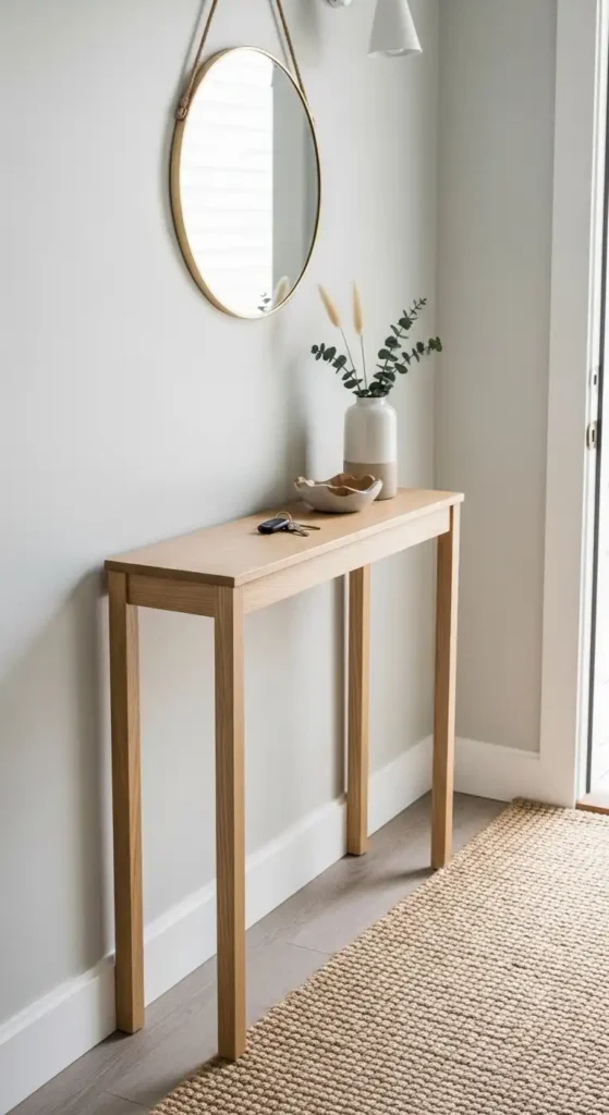 A narrow console table adds function without taking much space. Use it to hold keys, decor, or a small lamp.