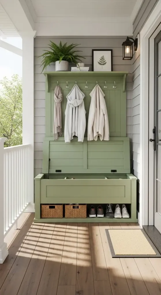 Hidden storage like benches with compartments or baskets helps keep shoes and essentials organized.