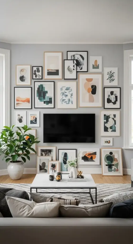 A gallery wall can camouflage the TV by blending it with framed art and photos. Choose matching frames and spacing for a clean look. This works well in modern, eclectic, or cozy interiors.